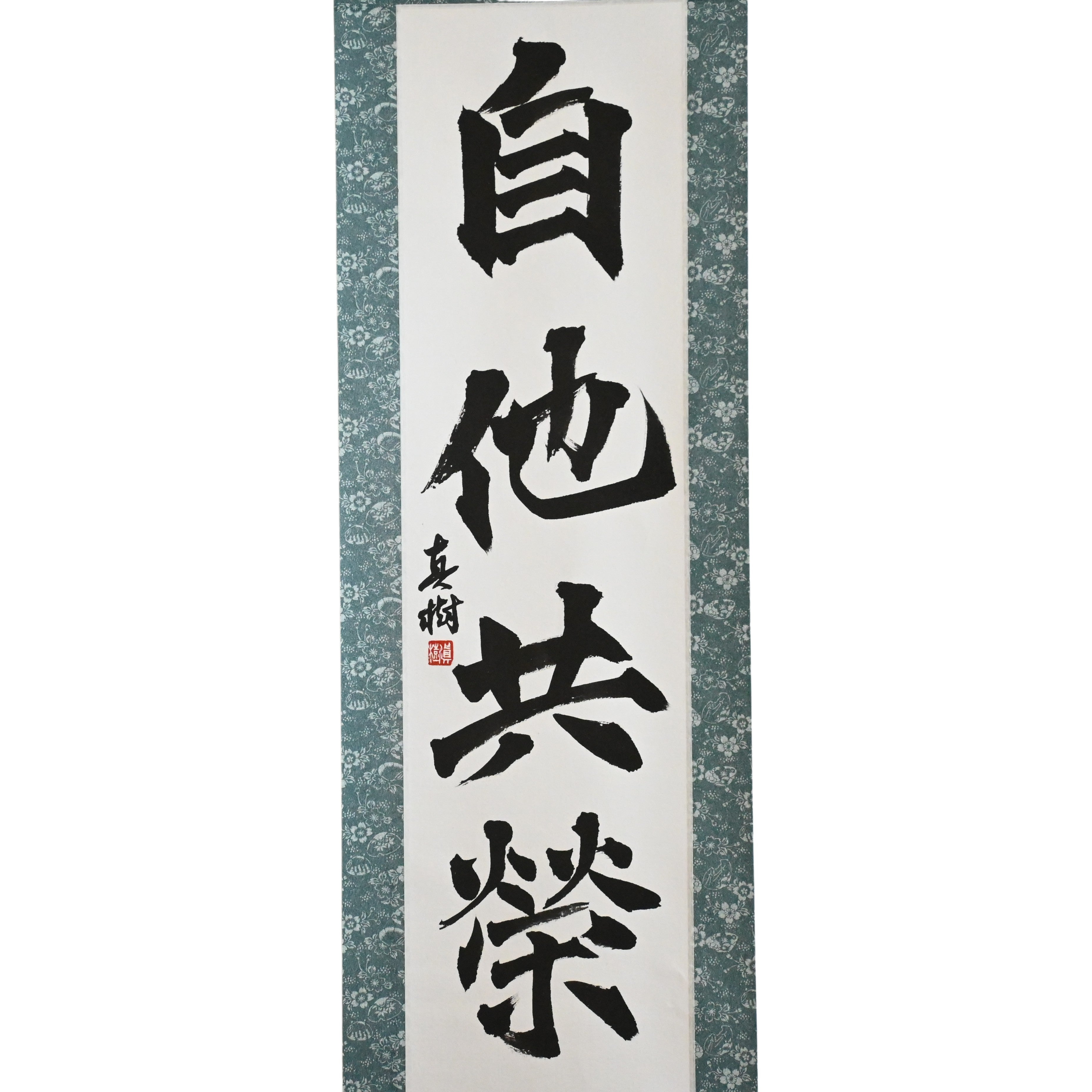 This Japanese calligraphy scroll features the timeless phrase 自他共栄 (Jita-Kyōei) — translated as "Mutual Welfare and Benefit". It is one of the two core principles of Judo, alongside 精力善用 (Seiryoku-Zenyō, "Maximum Efficient Use of Energy"), both established by Judo’s founder, Jigoro Kano (嘉納治五郎).