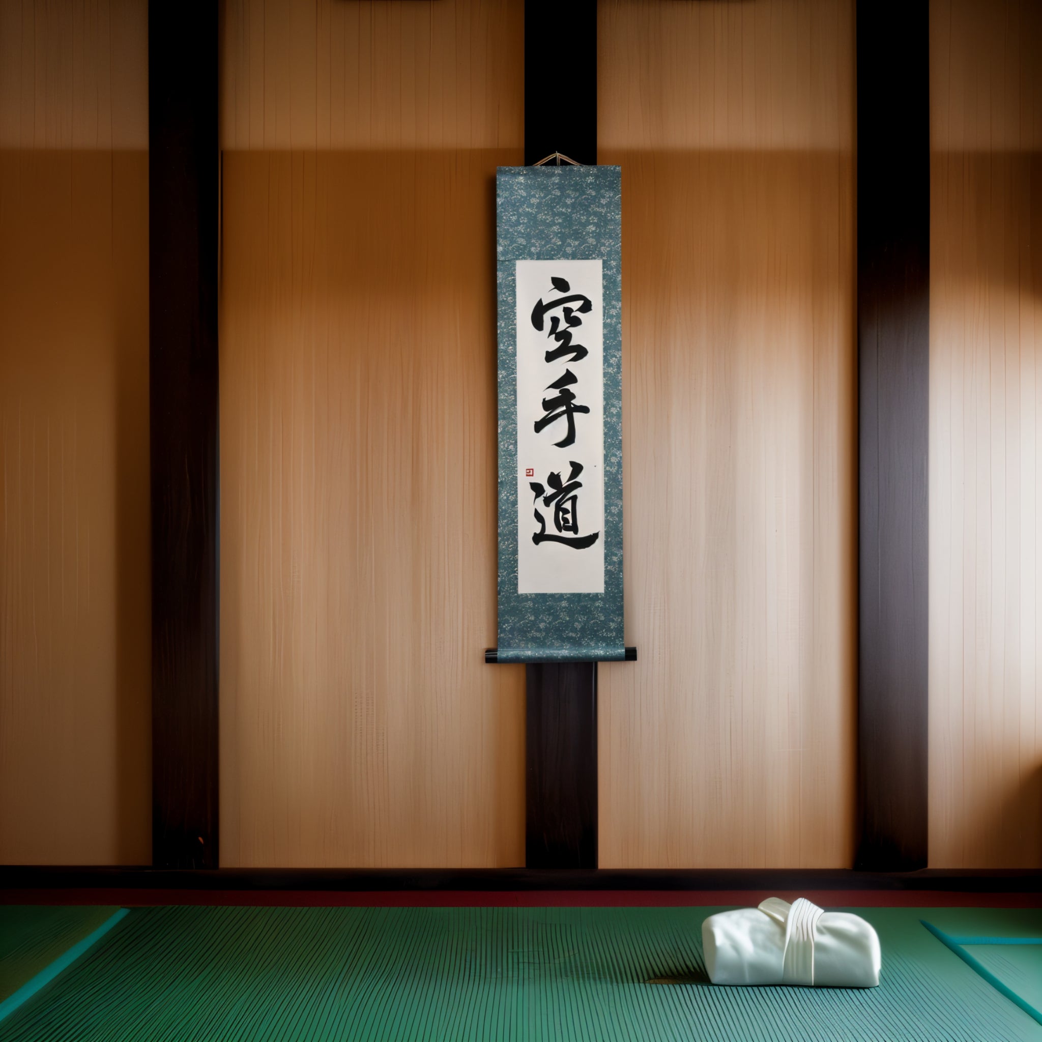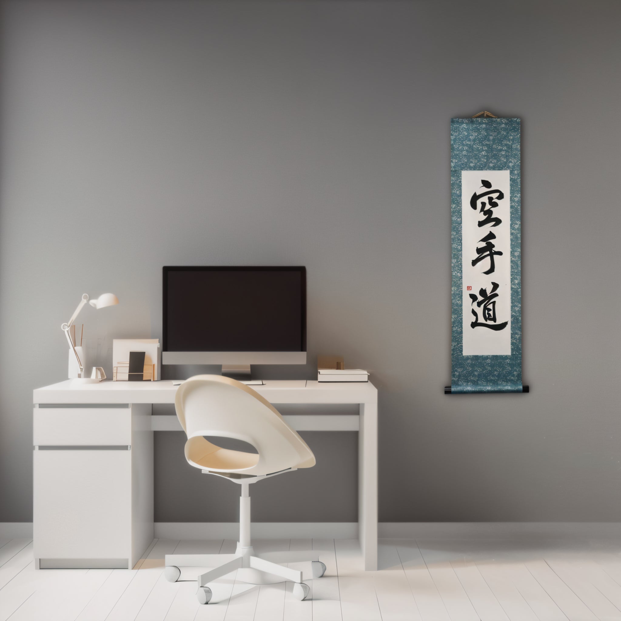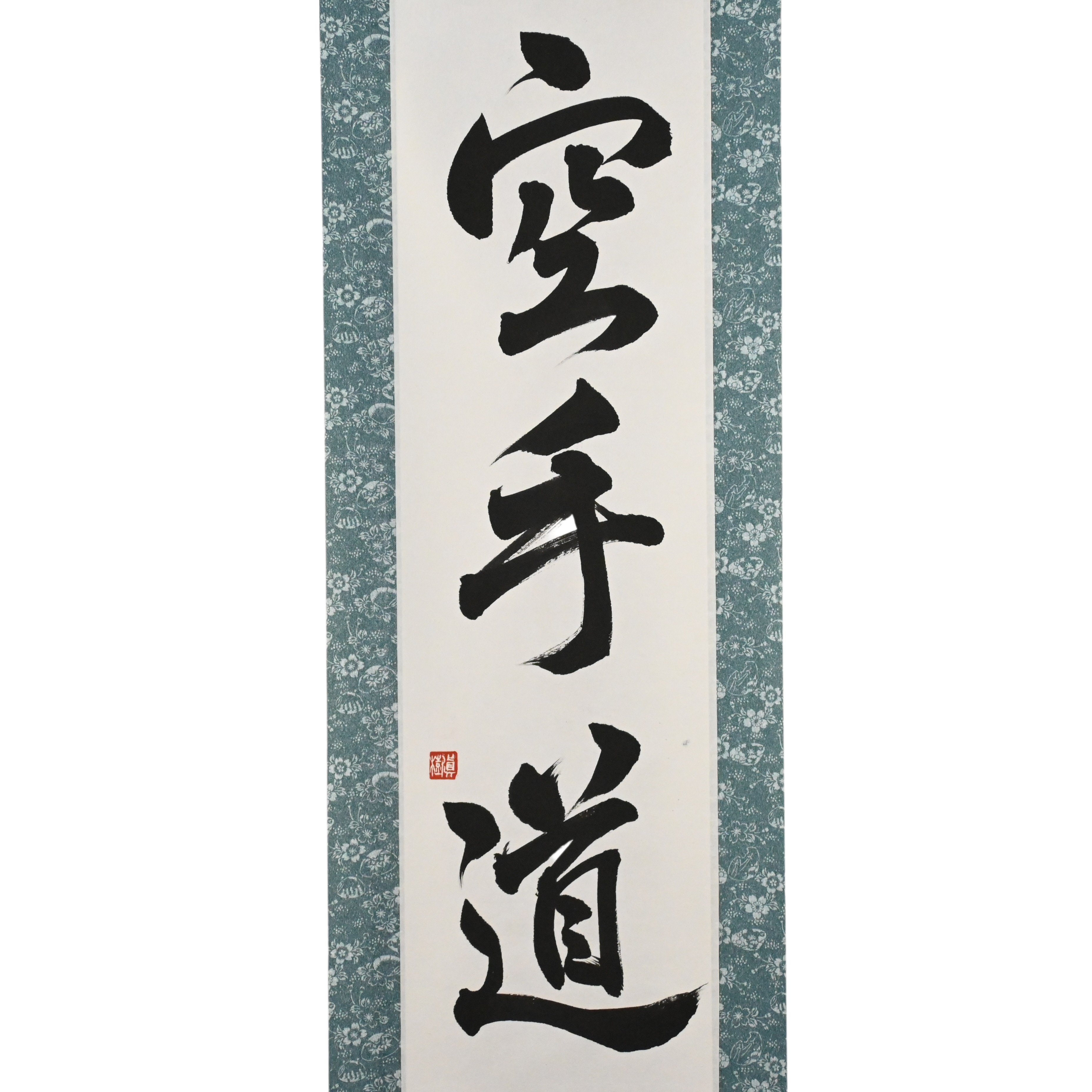 This calligraphy scroll features the powerful phrase 空手道 (Karate-do) — not merely a martial art, but a lifelong journey of discipline, respect, and inner strength.