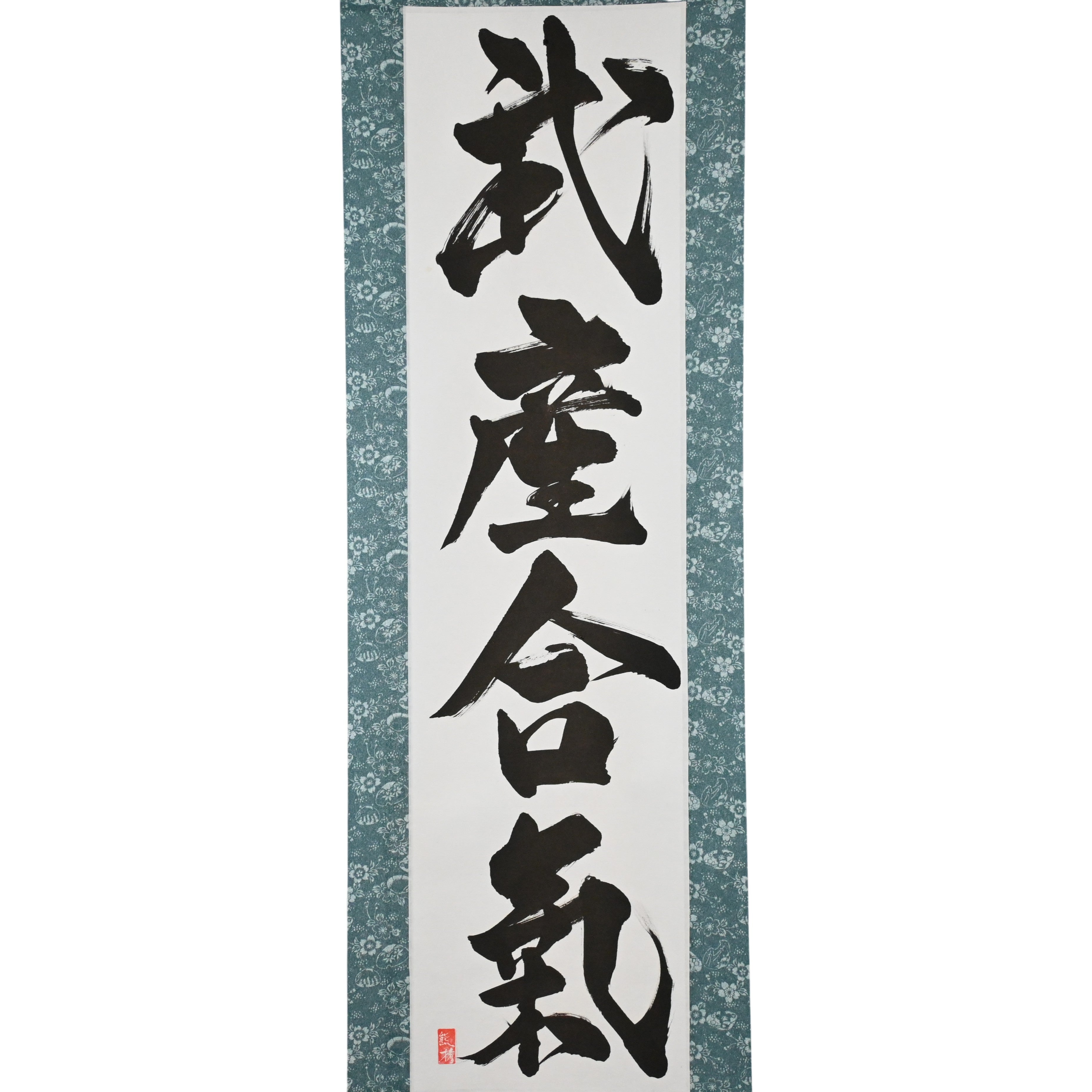 This Japanese calligraphy scroll features the deeply spiritual phrase 武産合気 (Takemusu Aiki) — “the martial birth of harmony”. A core expression of Aikido’s founder Morihei Ueshiba (植芝盛平), it encapsulates the highest realization of the art.